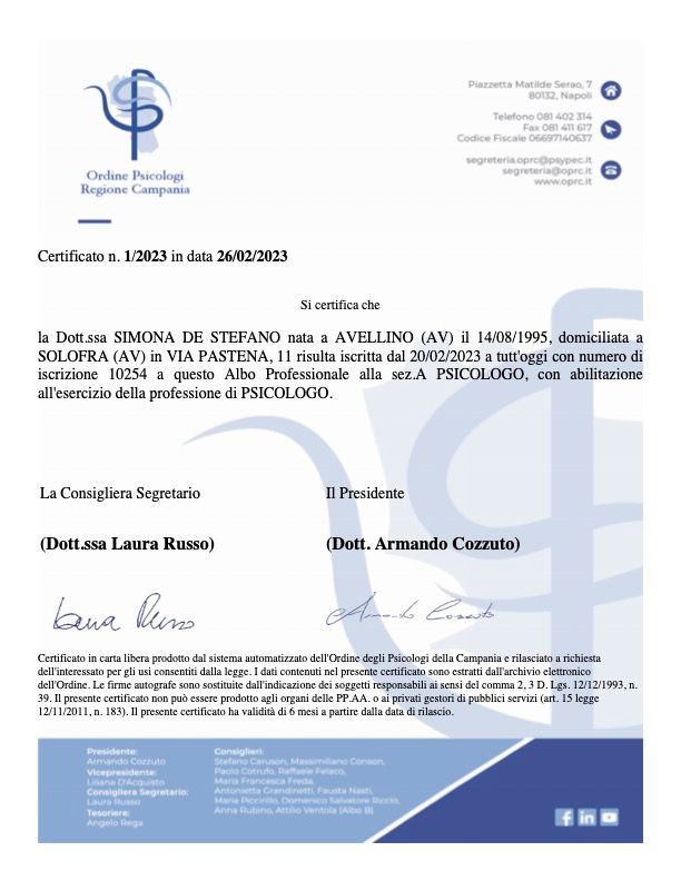 Iscritta all'Ordine degli Psicologi della regione Campania dal 2023, lavoro come psicologa - psicoterapeuta in formazione presso il mio studio privato che ha sede a Solofra (in provincia di Avellino).