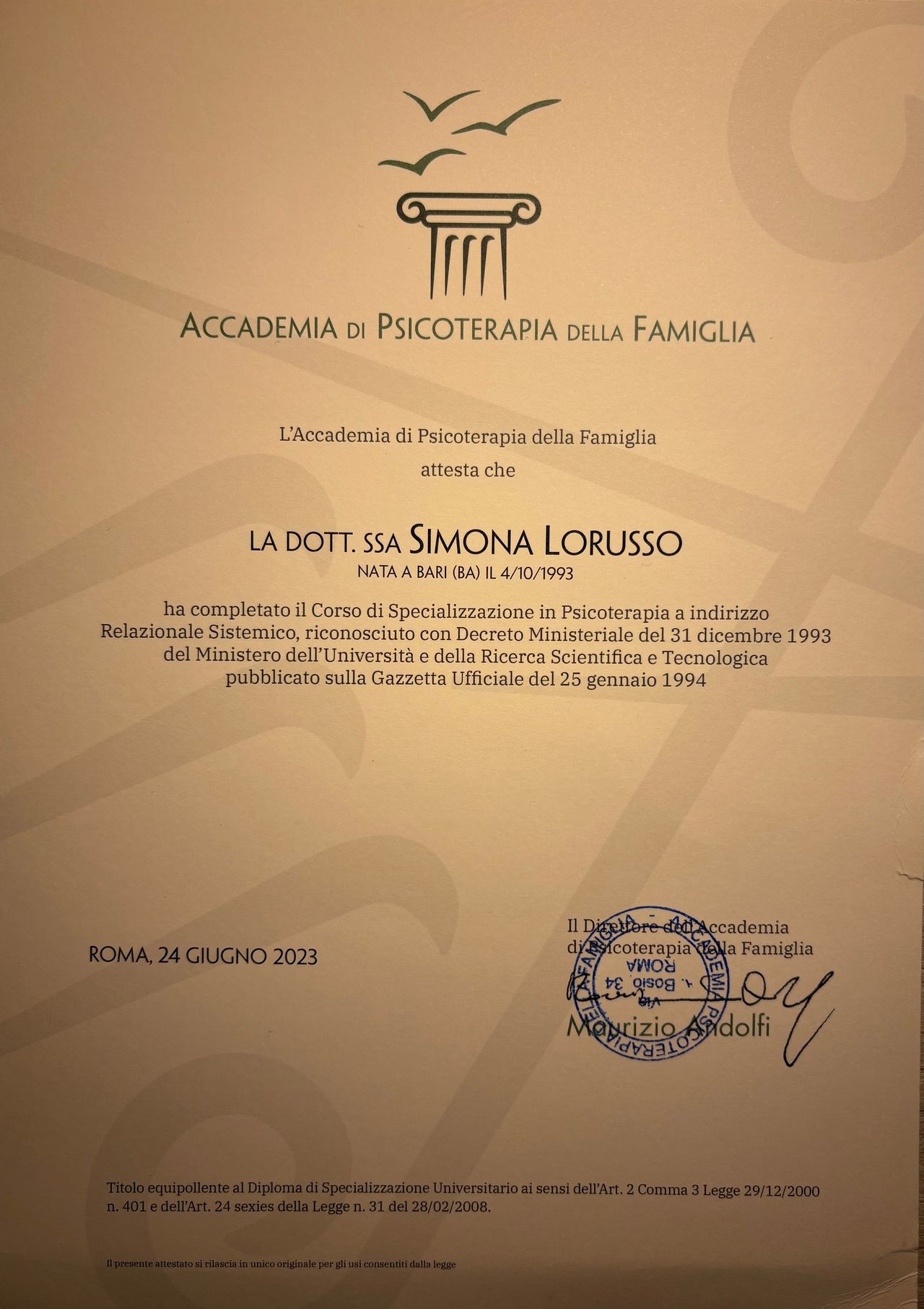 La mia esperienza con la dott.ssa Lorusso è stata assolutamente positiva.Professionale ed estremamente empatica, mi ha accompagnata nel percorso di psicoterapia, colmando quelle mancanze che da tempo non riuscivo a decifrare da sola.
