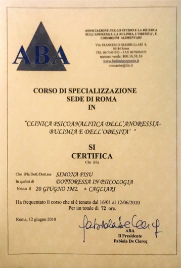 Nel mio percorso di formazione mi sono interessata a diverse problematiche, tra quelle che mi stanno più a cuore ci sono i Disturbi dell'Alimentazione. Dal lontano 2009, anno in cui ho conseguito il primo master sui DNA, ho sempre avuto un sogno: quello di aprire, nella mia Terra, un centro che si occupasse di questa patologie. Questo desiderio si è avverato nel 2017 con l'apertura di ANANKE Cagliari- Centro per la cura dei disturbi alimentari. "Una casa lilla£ in cui accogliamo le famiglie portatrici di queste tipologie di disagio.