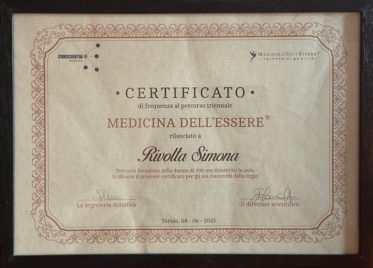 Di recente, a giugno 2025, ho completato un Master in Biopsicosomatica e PNEI che mi ha permesso di ampliare ulteriormente le mie competenze e integrare nuove prospettive nel mio lavoro.