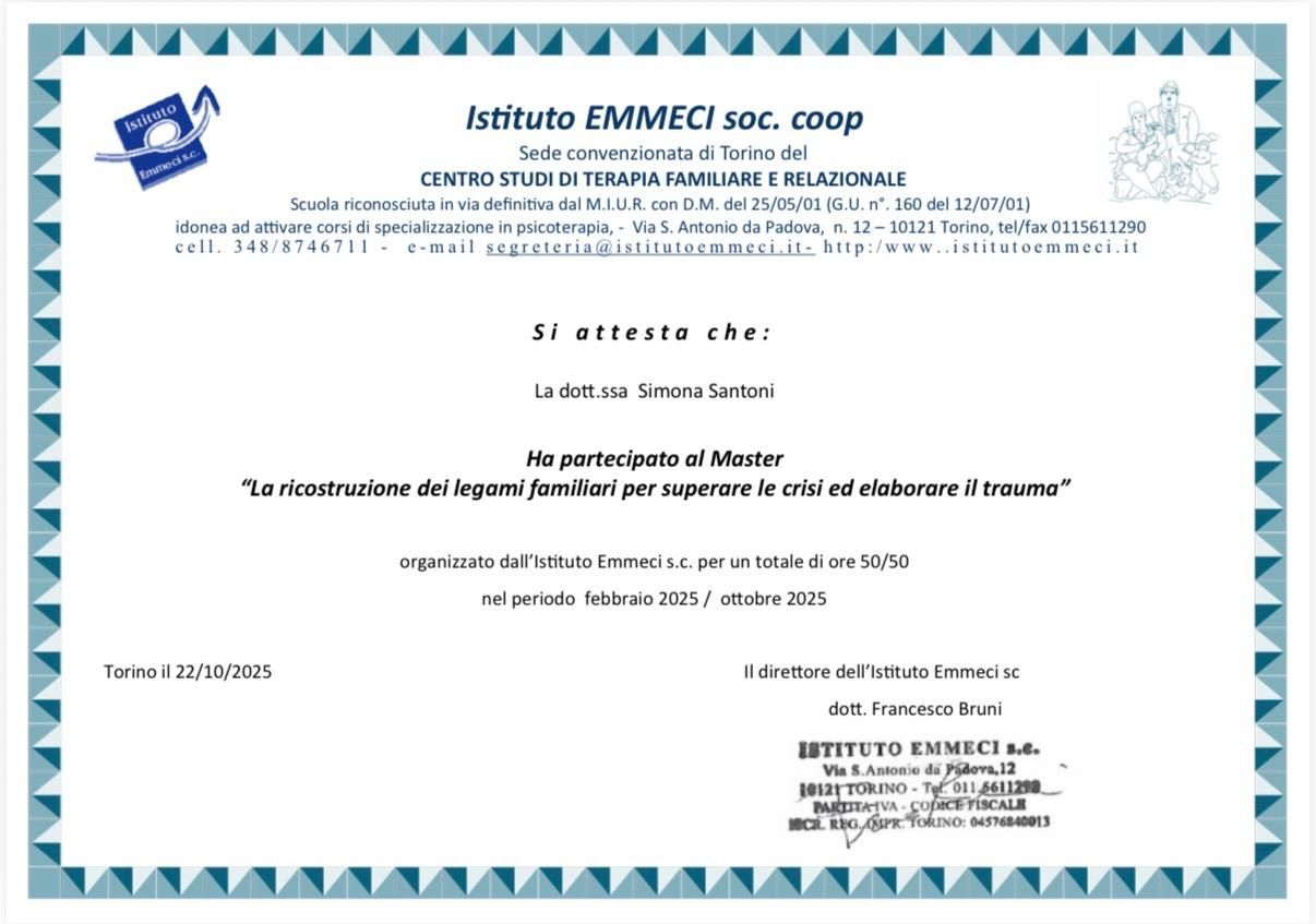Sono la Dott.ssa Simona Santoni, psicologa clinica, facilitatore in Mindfulness ed allieva in formazione in psicoterapia sistemico-relazionale e terapia della famiglia presso l'Istituto Emmeci di Torino.