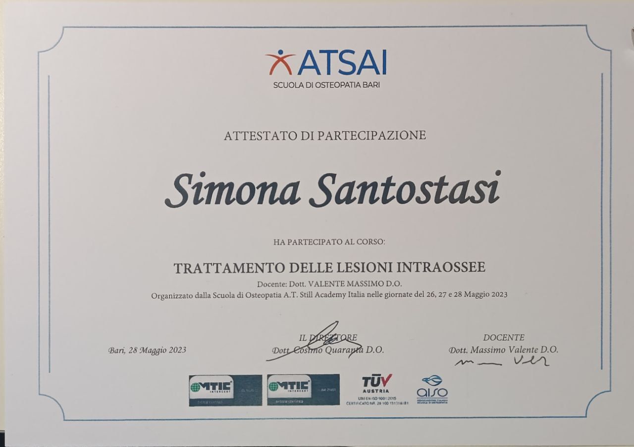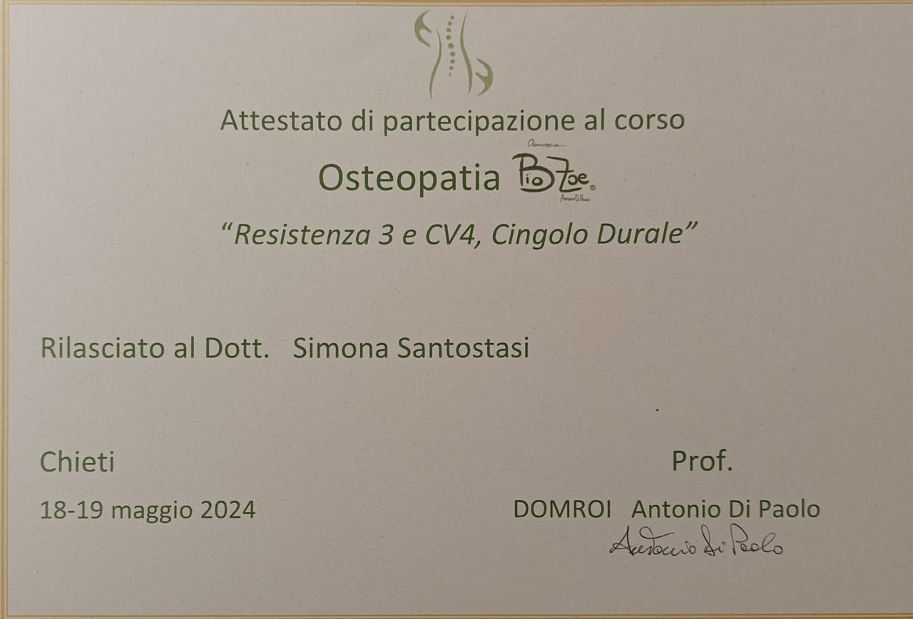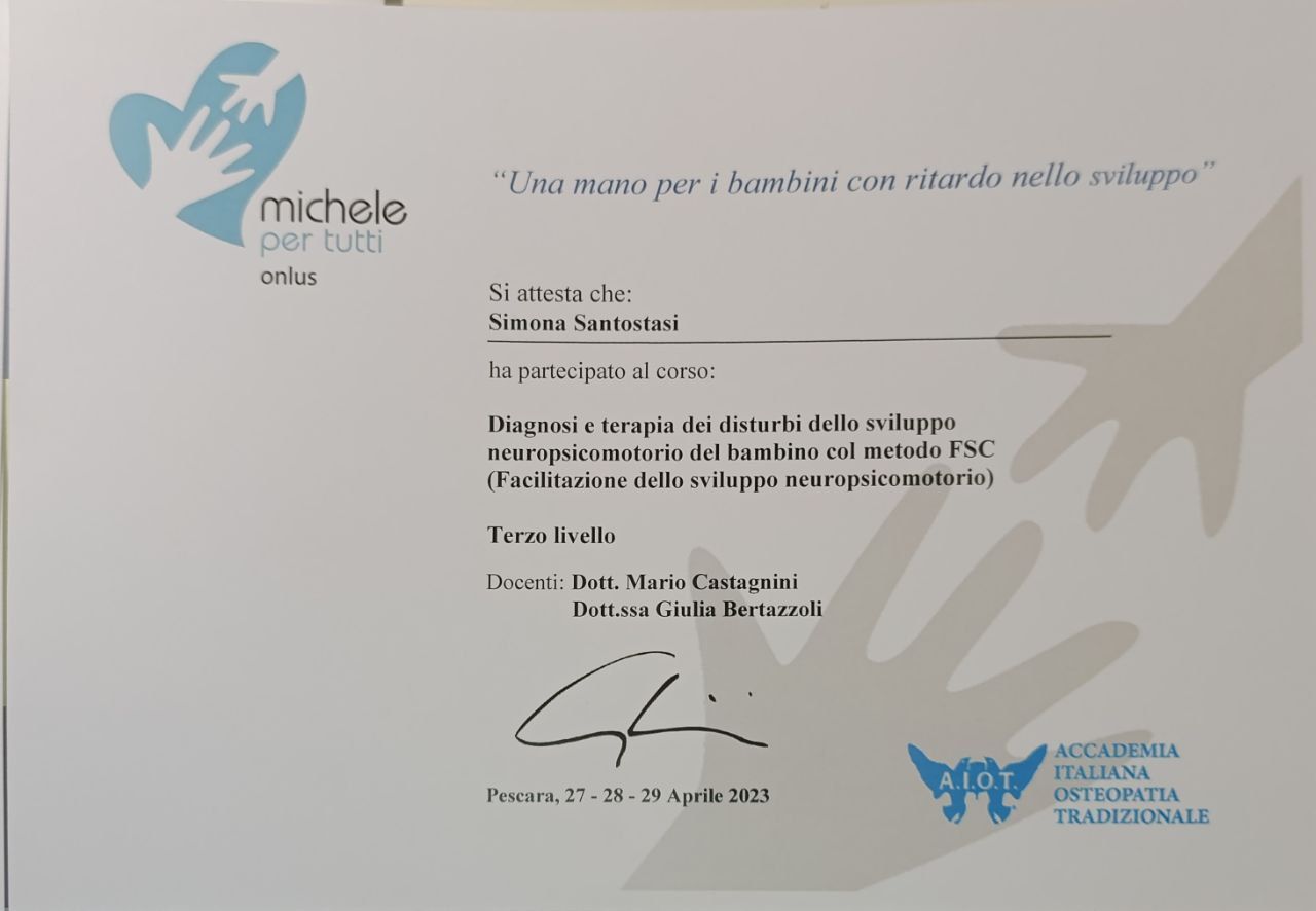 Il mio percorso di formazione si è svolto presso l’A.I.O.T. (Accademia Italiana Osteopatia Tradizionale) di Pescara, con durata di 5 anni. Durante questi 5 anni ho avuto l’opportunità di svolgere diverse ore di tirocinio presso: -Centro ABATON di Pescara - Associazione ARDA