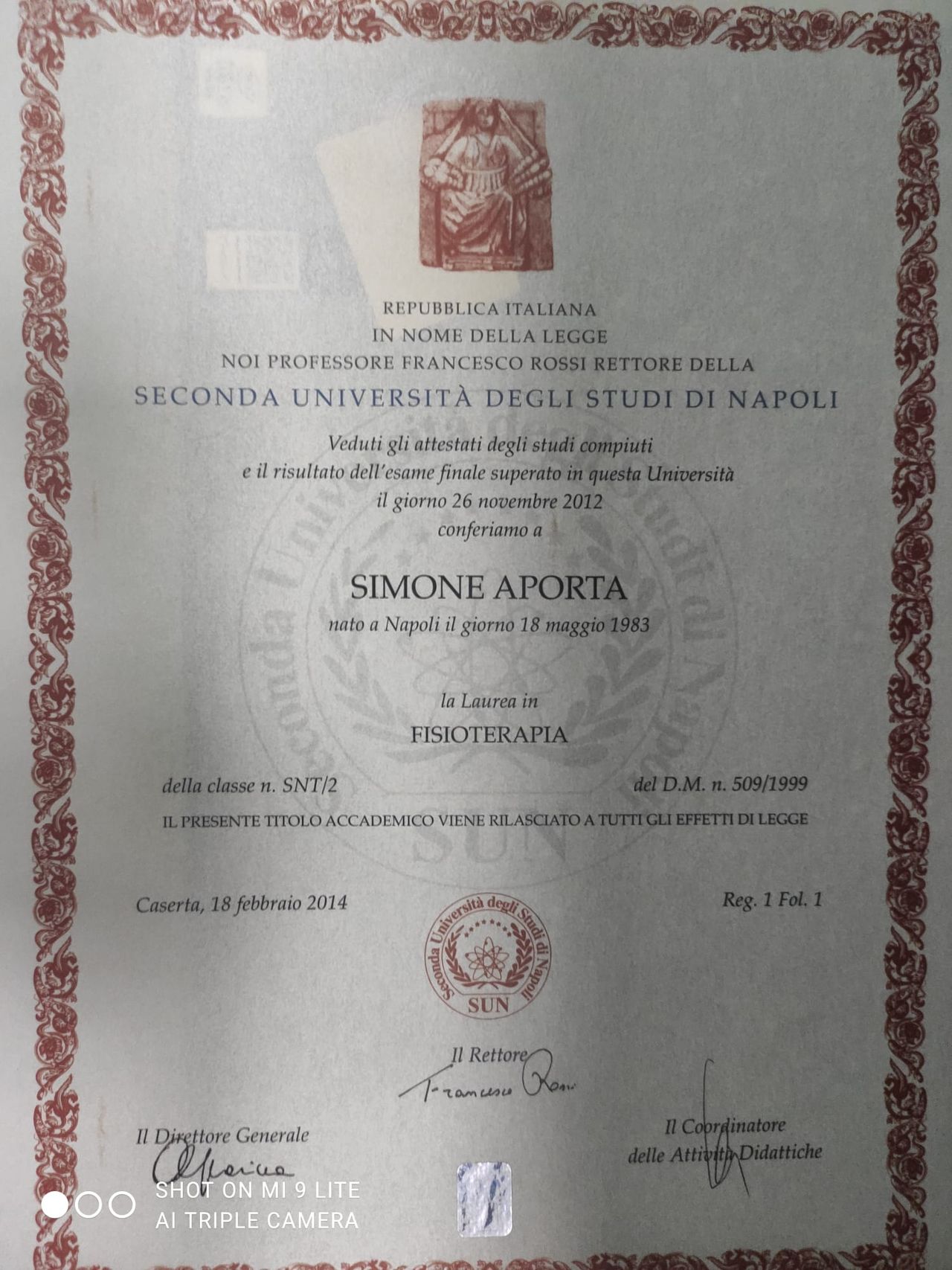 Simone Aporta dottore fisioterapista, laureato presso la S.U.N. - Seconda Università di Napoli nel 2012, con tirocinio nell'Azienda Ospedaliera Moscati di Avellino. In precedenza consegue la laurea in Scienze Motorie presso l'università Parthenope di Napoli.