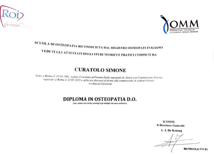 Ho concluso il corso di Osteopatia presso l’ICOMM, a Roma. Attualmente sto frequentando il corso di Osteopatia Pediatrica presso “Osteobimbo”.
