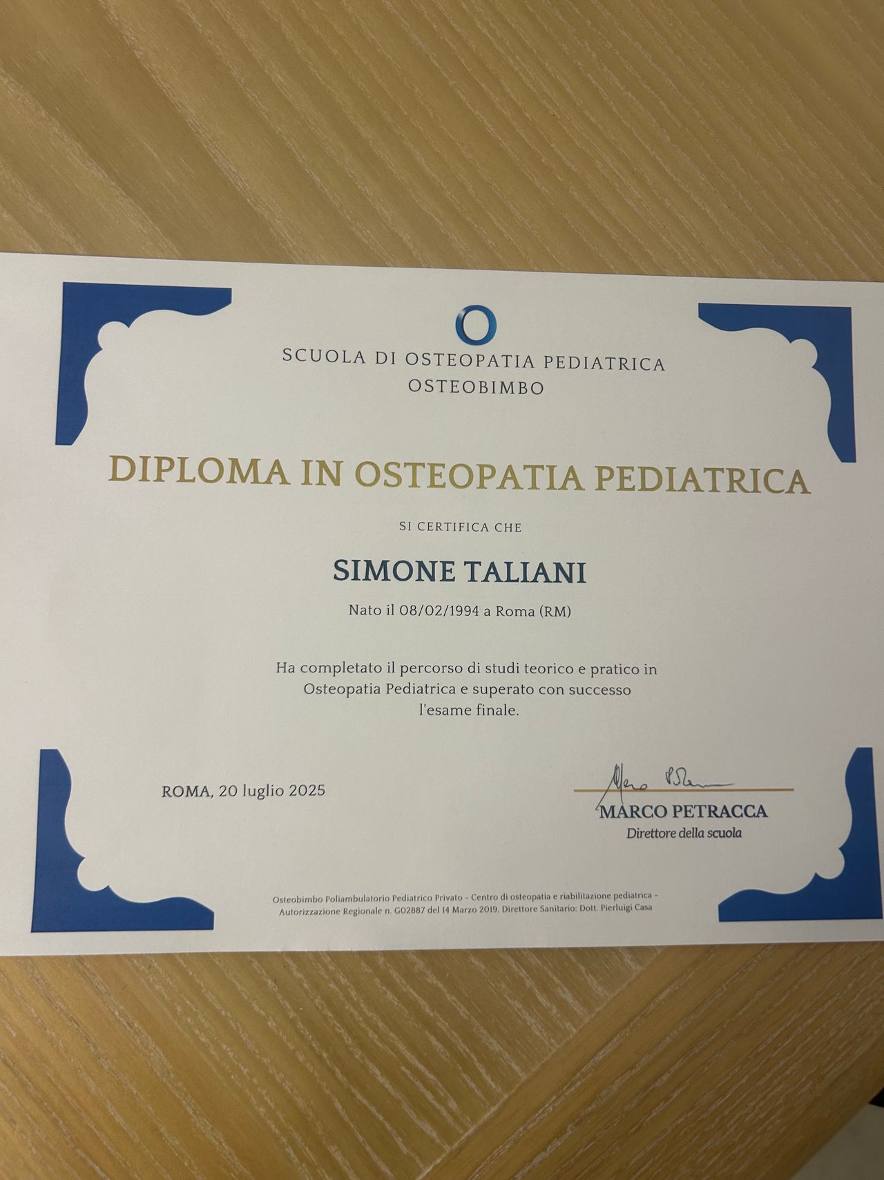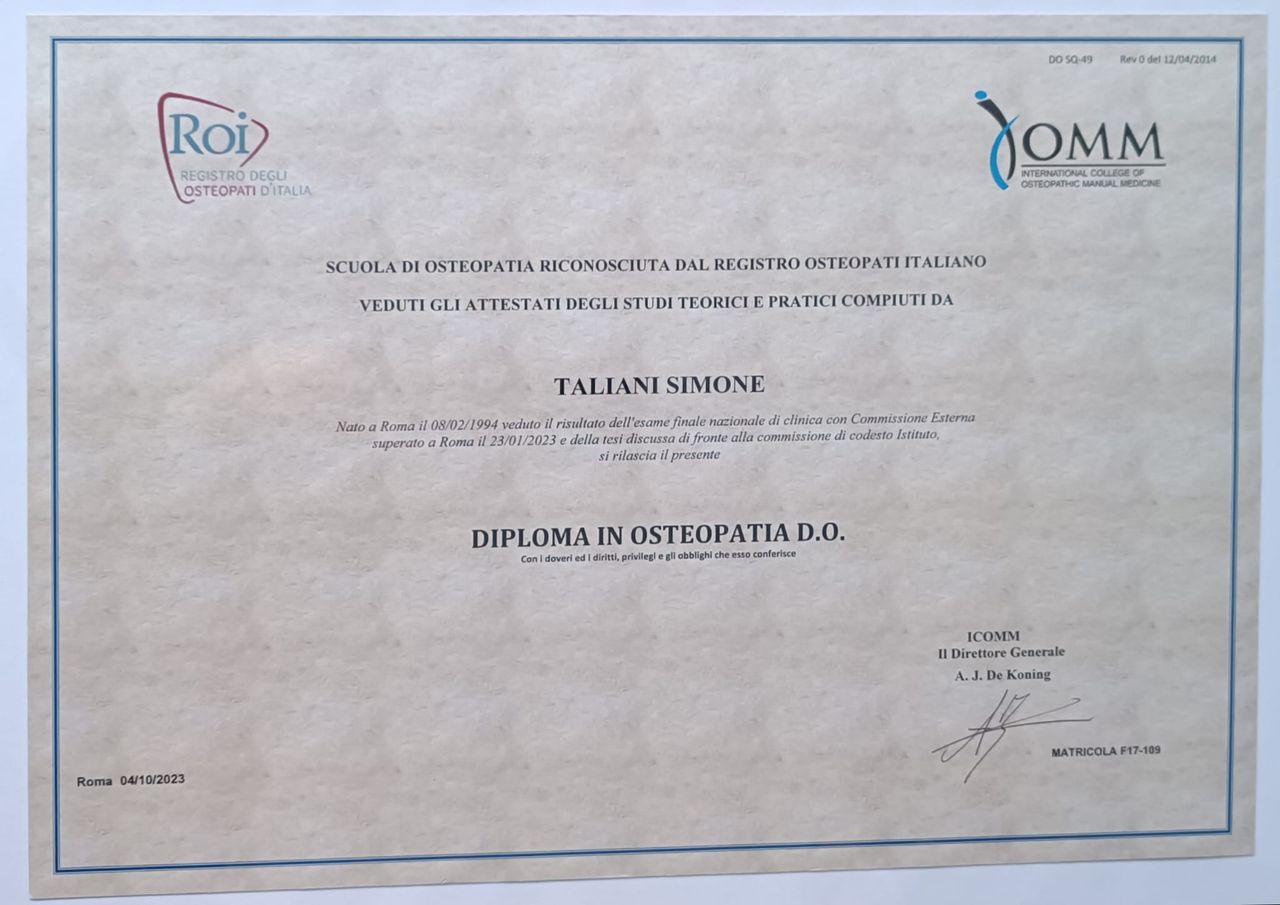 Sono Simone Taliani osteopata D.O. Ho conseguito la laurea in scienze motorie nel 2017 e subito dopo ho cominciato il mio percorso osteopatico all' International College of Osteopathic Manual Medicine di Roma conclusosi nel 2022. Pochi mesi più tardi ho intrapreso la formazione in osteopatia pediatrica presso il Centro di Osteopatia e Riabilitazione Pediatrica OSTEOBIMBO terminato nel 2025; contemporaneamente il mio interesse si è focalizzato sull'osteopatia biodinamica, motivo per il quale ho deciso di iniziare questo nuovo ed affascinante viaggio. Credo fermamente nelle capacità di auto guarigione interne e nelle potenzialità sconfinate del nostro sistema di salute. Sento il bisogno di mettermi a disposizione degli altri con amore e dedizione fungendo da ponte tra il paziente e la sua migliore condizione possibile. Tutto il mio impegno e le mie capacità sono al servizio di chi vorrà il mio aiuto, cercando insieme di raggiungere la Salute.