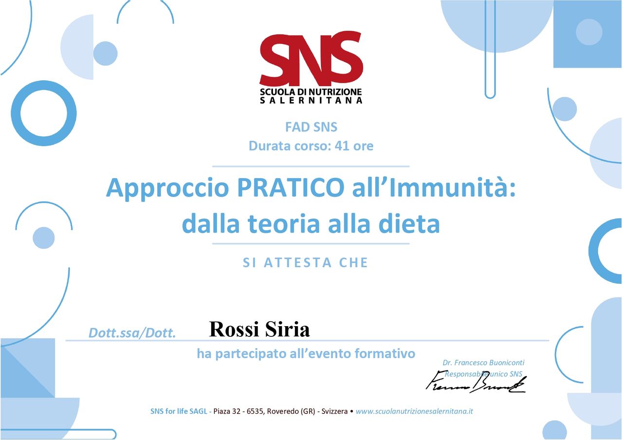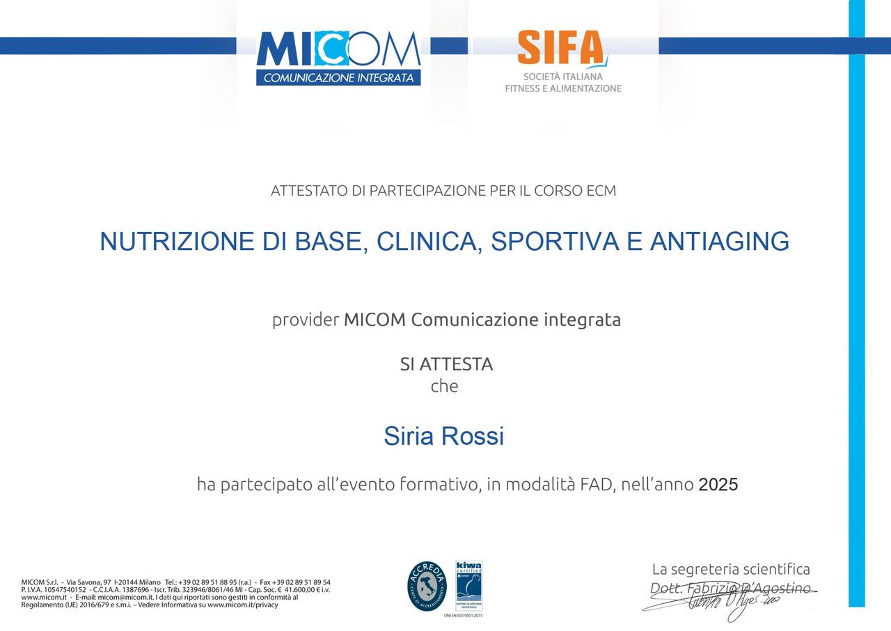 In seguito ho intrapreso la laurea magistrale in Biologia Molecolare e Applicata (curriculum Biosanitario e della Nutrizione) presso l’Università degli Studi di Firenze, laureandomi con 110 e lode. Dopo l'abilitazione alla professione e l'iscrizione all'Ordine dei Biologi ho iniziato a frequentare dei corsi di formazione e perfezionamento, che continuo tutt’ora a svolgere e che continuerò in futuro, poiché ci sono sempre nuove scoperte in quest’ambito, perciò un aggiornamento continuo è importantissimo per poter offrire al paziente la migliore consulenza nutrizionale di cui ha bisogno.