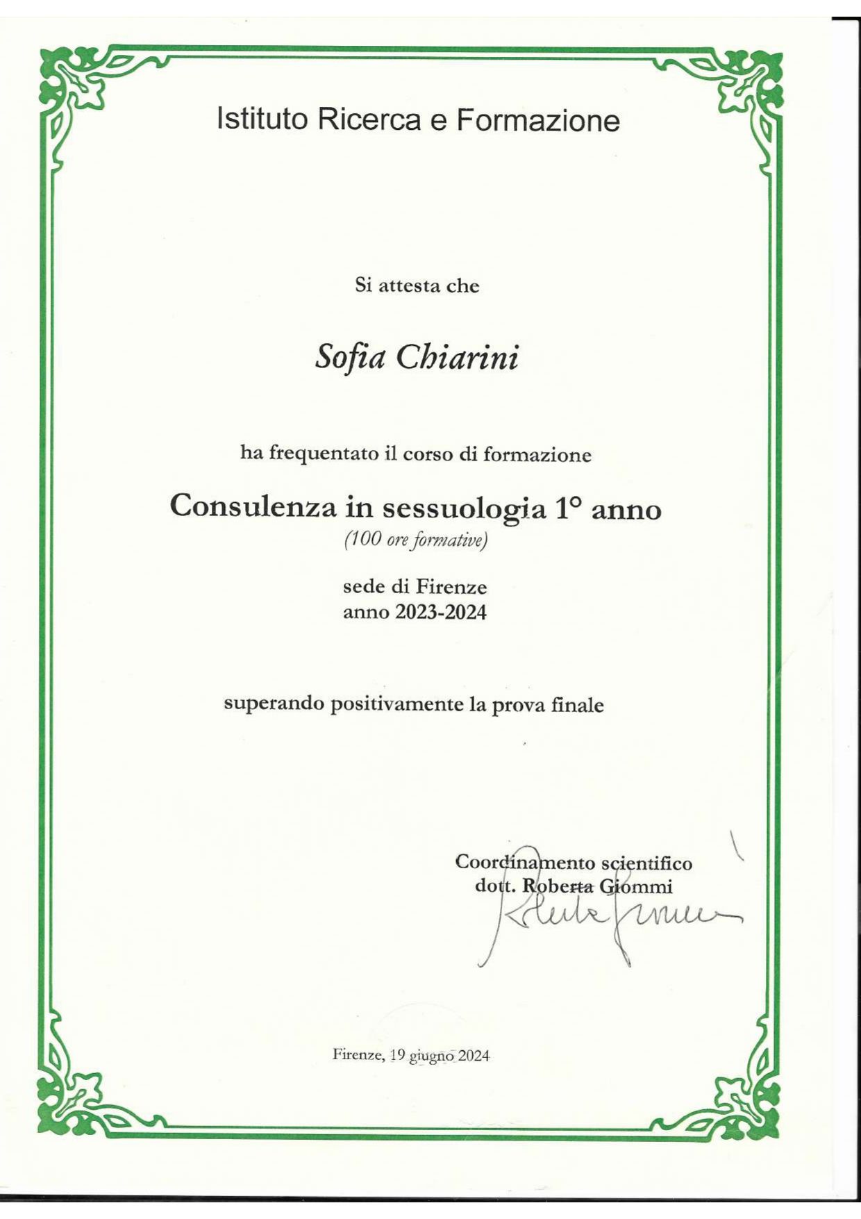 Sono seguita dalla Dottoressa Chiarini da circa due mesi e sin dal primo momento mi sono sentita accolta. Soffro di dolore durante i rapporti e con la Dottoressa mi sono sentita compresa e aiutata per la prima volta. Ha ascoltato attentamente la mia storia clinica e abbiamo iniziato a fare un lavoro che mi sta già dando dei miglioramenti. Sono davvero soddisfatta di aver iniziato questo percorso.