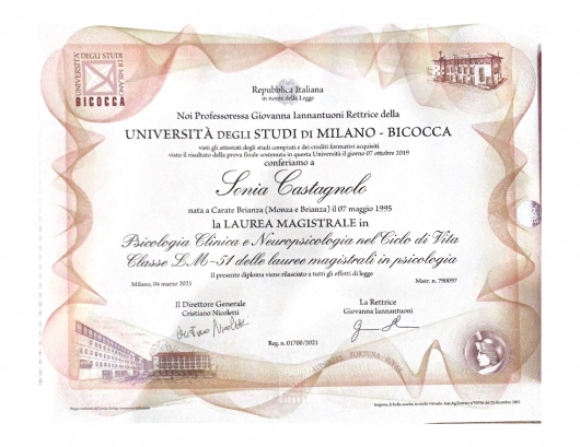 Sono la Dott.ssa Sonia Castagnolo, psicologa iscritta all’Albo degli Psicologi della Lombardia (n. 24095) e in formazione come Psicoterapeuta Cognitivo-Comportamentale.