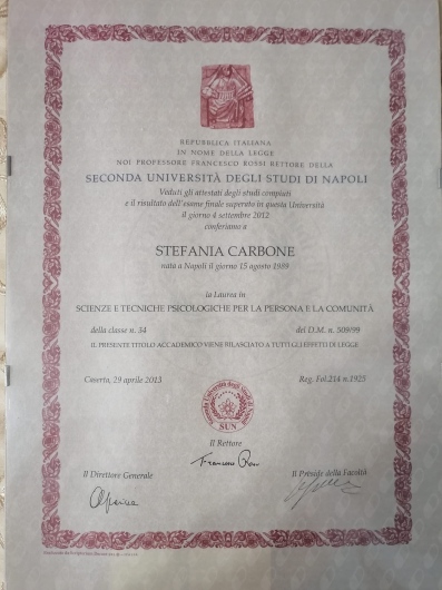 Mi trovavo in un periodo poco chiaro della mia vita, sopraffatta dall'ansia, dalle paure e bloccata nei miei pensieri. Ho iniziato il percorso con la Dottoressa Stefania e già dalle prime sedute percepivo una piacevole serenità, un'empatia particolare come se ci conoscessimo da tempo. Nel corso dei mesi passati insieme, mi sono sempre sentita ben accolta, ascoltata con estrema attenzione e totalmente a mio agio. Le sedute avvenivano regolarmente ed ogni volta percepivo da parte della Dottoressa grande gioia nel condividere ogni piccolo e grande traguardo. Consiglio vivamente il lavoro della Dottoressa, una persona che sa fare il suo lavoro con amore e dedizione, un'ottima spalla su cui contare!