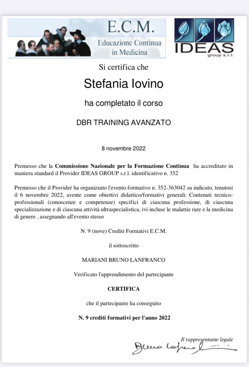 Specializzanda in DBR (Deep Brain Reorienting) ovvero una modalità psicoterapeutica per il trattamento dei traumi.