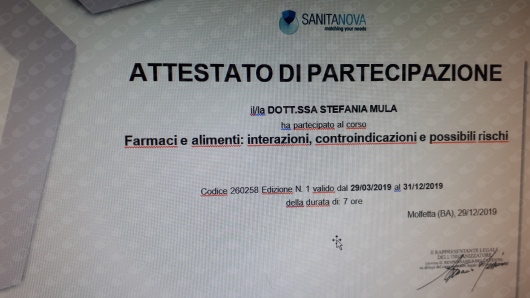 -Corso Nutrizione anti-infiammatoria e osteopatia. Supporti sinergici per il benessere della persona" presso U.P.A.I.Nu.C.(Università Popolare, Accademia internazionale di Nutrizione) . Docente :Dott.Prof. Silvio Spinelli