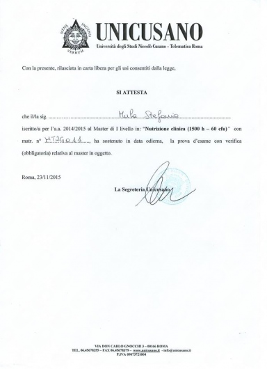 Ho conseguito un Master annuale in Nutrizione Clinica presso l'Università Unicusano di Roma.
