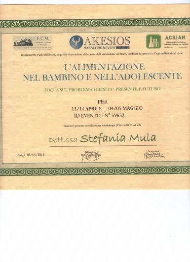 - Corso " L'alimentazione nel bambino e nell'adolescente" (A.C.S.I.A.N.) Pisa