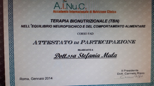 -Corso " Terapia Bionutrizionale (TBN) nell'equilibrio NEUROPSICHICO e nel comportamento alimentare" presso Accademia Internazionale di Nutrizione (A.I.Nu.C.) Fad Roma