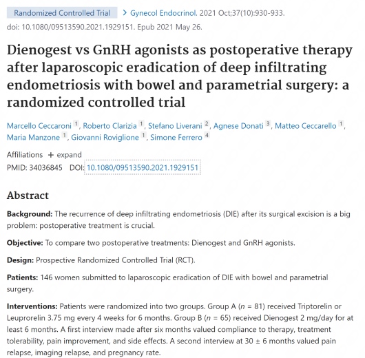 Dienogest vs GnRH agonists as postoperative therapy after laparoscopic eradication of deep infiltrating endometriosis with bowel and parametrial surgery: a randomized controlled trial. - Gynecological Endocrinology, 2021