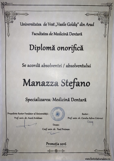 Sono Stefano Manazza, laureato in Odontoiatria all'Universita UVVG di Arad, Romania.