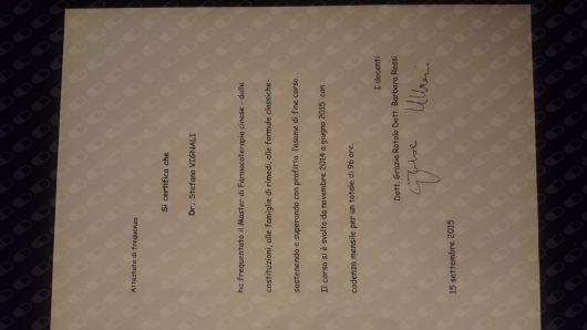 Nel 2015 ho terminato il Master annuale in Farmacoterapia Cinese secondo le Formule Classiche, Metodo Kampo presso il Centro Studi Jing Fang a Pavia sotto la guida della Dottoressa Rotolo.