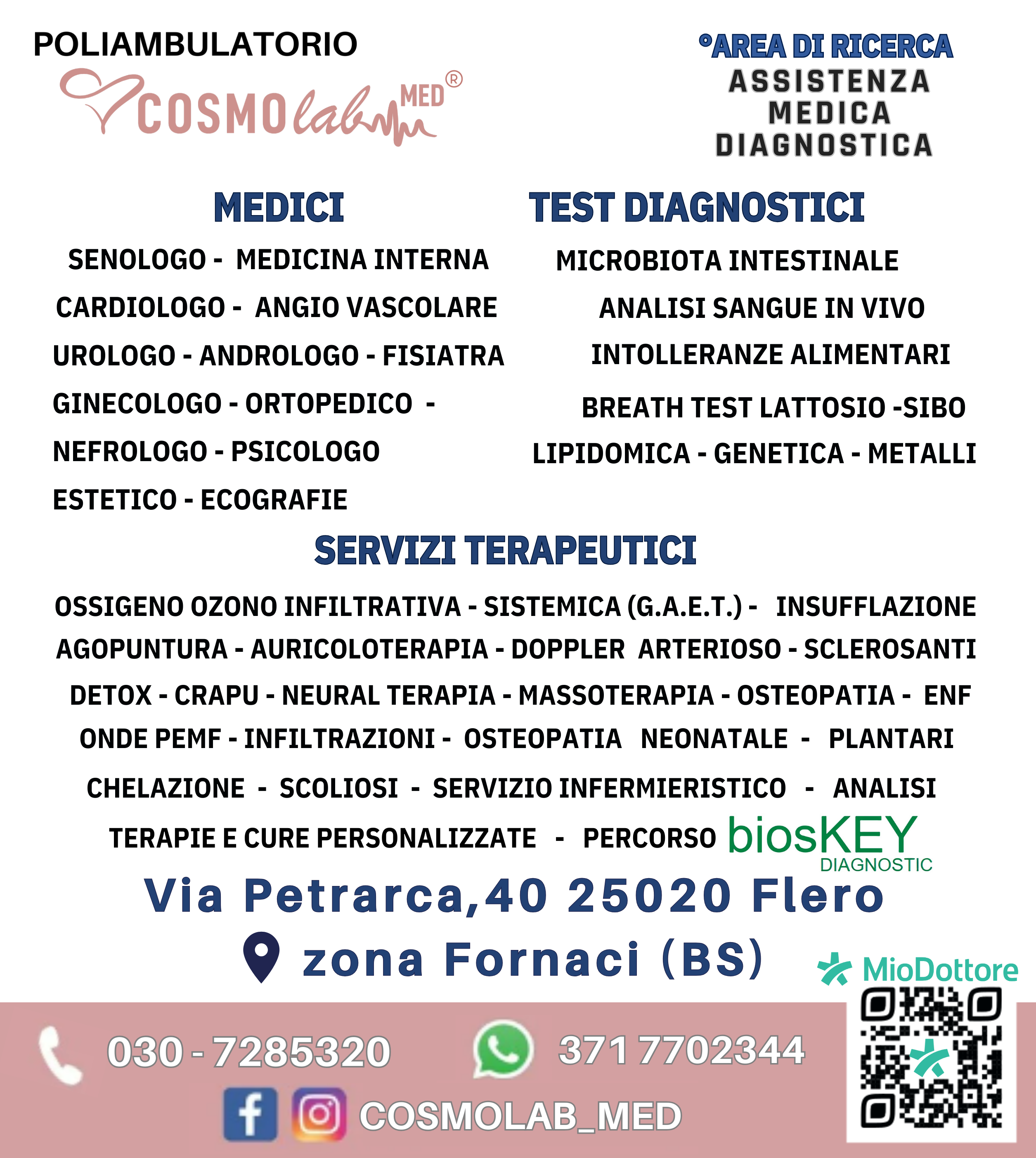 Dal connubio tra la medicina clinica e funzionale nasce Cosmolab MED poliambulatorio medico specializzato in prevenzione e diagnostica, il primo centro con visione integrata olistica per l’equilibrio Corpo-Mente-Spirito.
