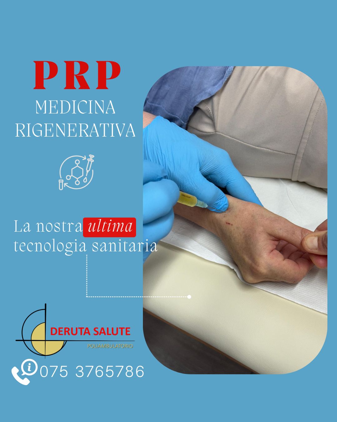 Il Poliambulatorio Deruta Salute è uno dei pochissimi centri in Umbria autorizzato a svolgere il PRP (Plasma Ricco di Piastrine), un trattamento medico RIGENERATIVO che utilizza il tuo stesso sangue per favorire la guarigione dei tessuti. Indicato in ORTOPEDIA, MEDICINA ESTETICA , CUOIO CAPELLUTO.