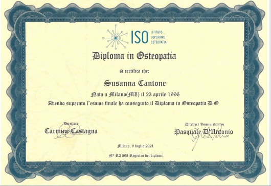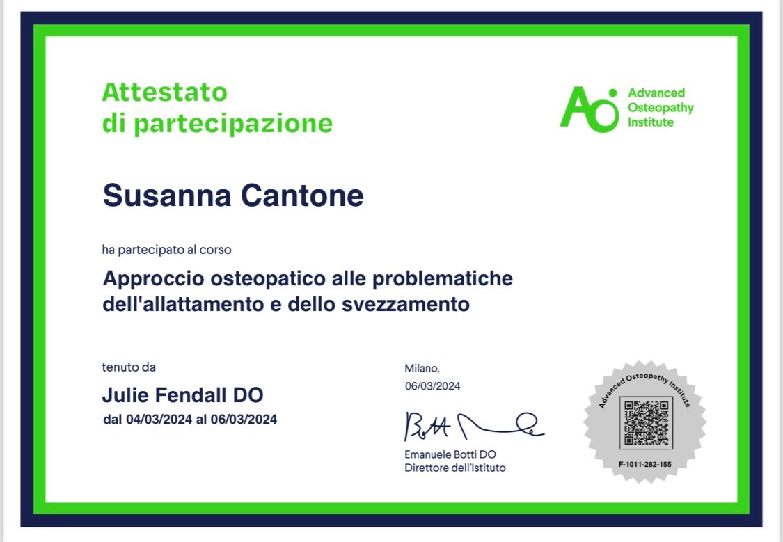 Sono Susanna Cantone, laureata in osteopatia presso l'Istituto Superiore di Osteopatia. Sono specializzata in Osteopatia pediatrica e neonatologia, per la gravidanza e post-partum presso l'Advanced Osteopathy Institute. Ho conseguito il titolo di operatrice del metodo FSC con il dottor Mario Castagnini, neurologo. Mi sto formando come consulente allattamento IBCLC presso la scuola “Formazione Allattamento” per integrare al meglio il mio lavoro con la diade mamma-bambino. Lavoro negli studi di Milano: