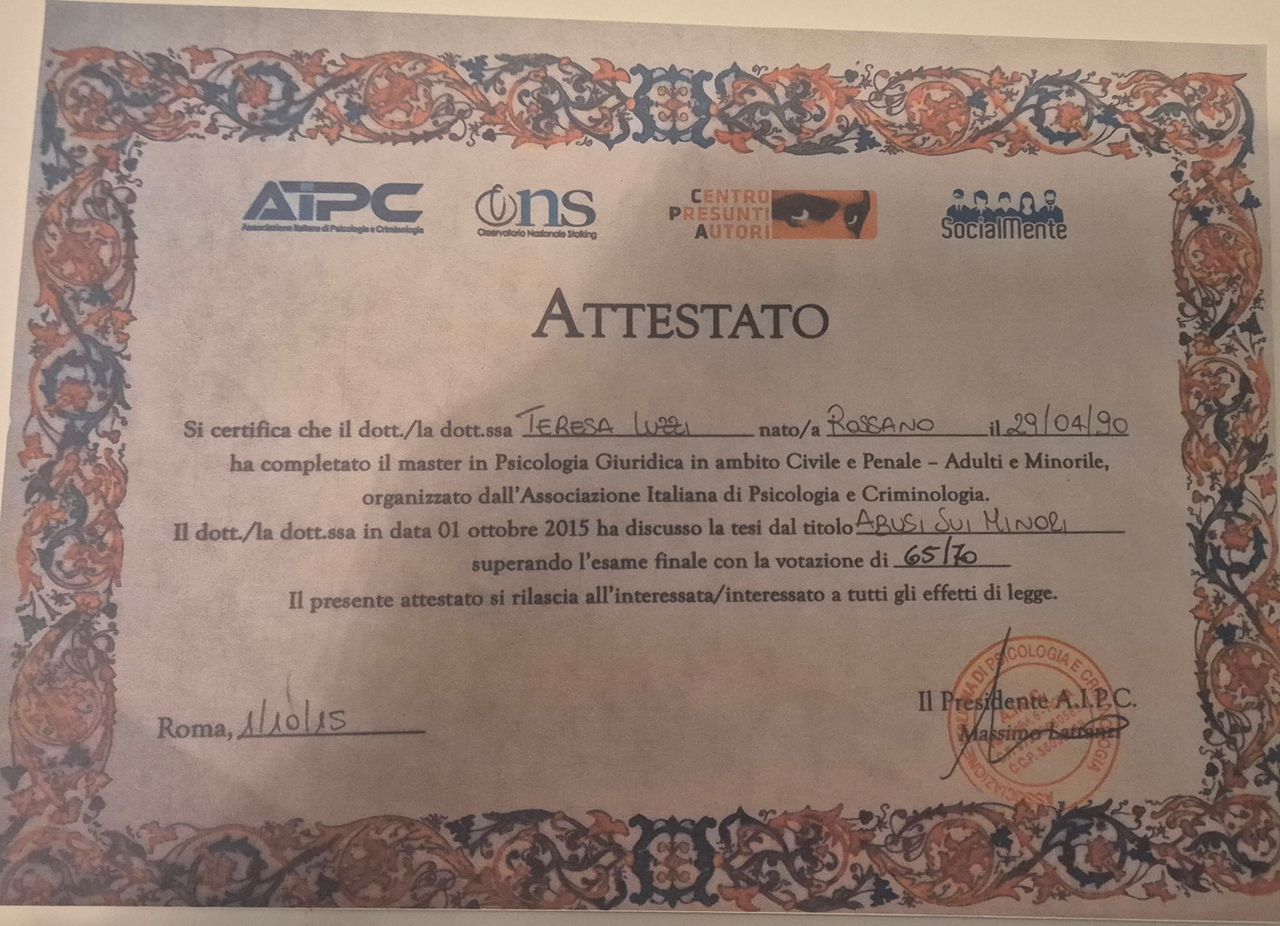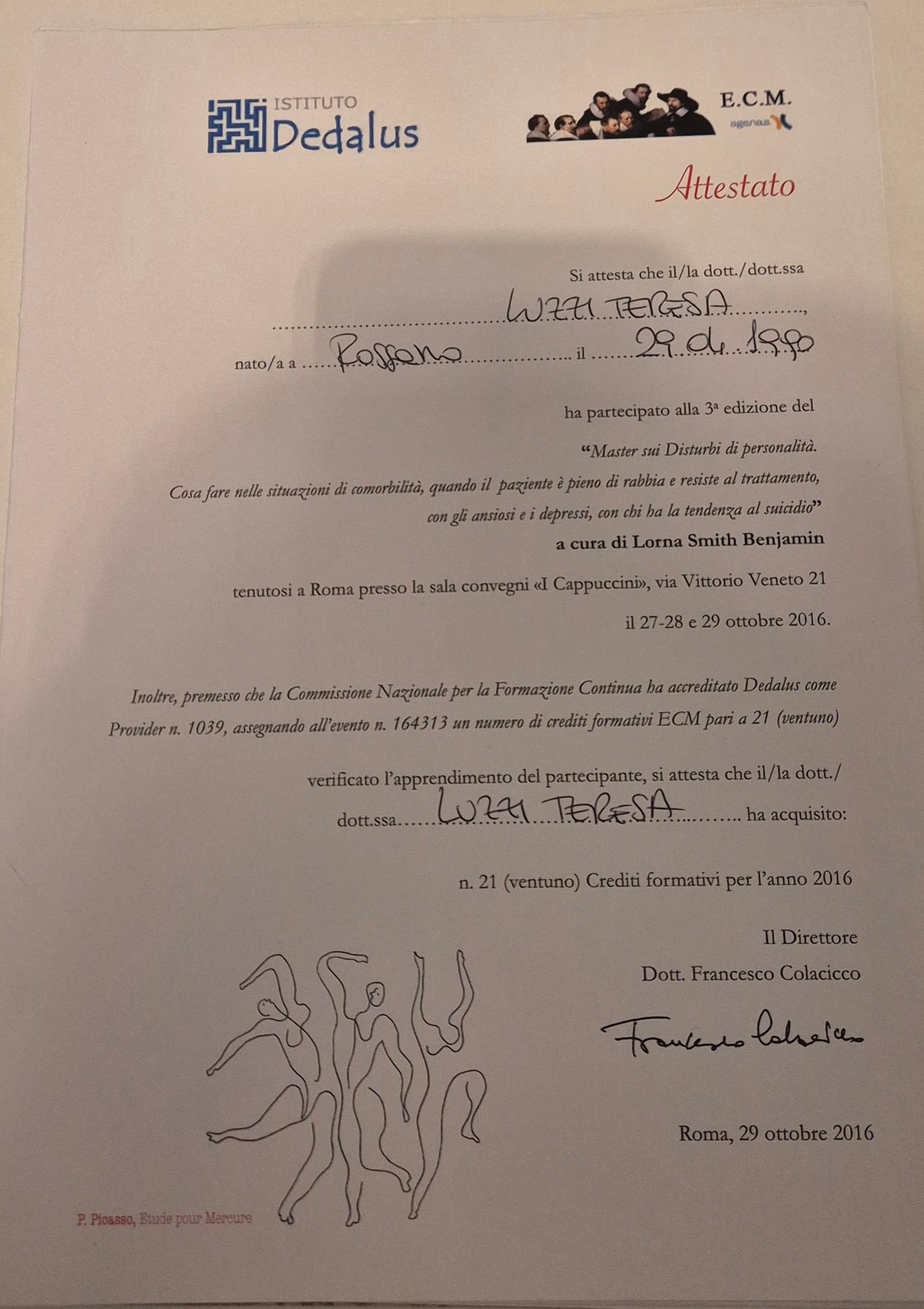 Uno degli aspetti che curo maggiormente nel mio lavoro è l'aggiornamento costante dei progressi, delle evoluzioni, degli sviluppi nell'ambito di ricerca. Partecipo con molto interesse a seminari, convegni, corsi di aggiornamento, master. La psiche è una continua scoperta e da psicoterapeuta sento il dovere di rimanere sempre aggiornata.
