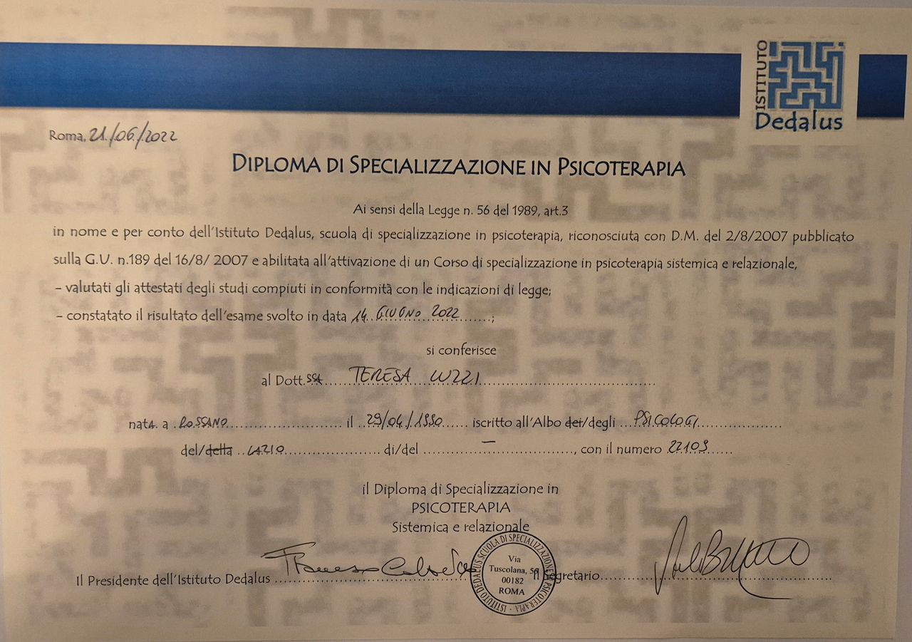 Ho iniziato il mio percorso con Teresa poco più di 3 anni fa. Teresa è una terapeuta eccezionale: ti ascolta e ti spinge ad ascoltarti ed a capire che forma hanno i tuoi pensieri. Non ha la pretesa di spiegarti esattamente quello che succede, ma ti aiuta a capirlo, fornendoti strumenti concreti non solo per affrontare il passato ma anche per capire meglio il futuro.