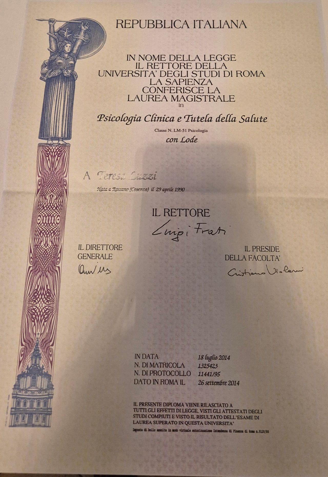 Sono Teresa Luzzi, psicologa e psicoterapeuta ad orientamento sistemico-relazionale