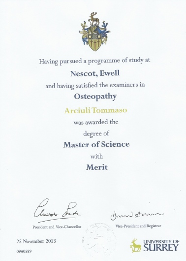 Nel 2013 completo la formazione con il Msc in Osteopathy presso l'Università del Surrey (UK).