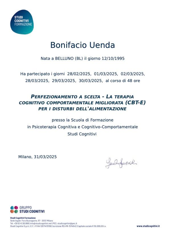 Sono specializzata nel trattamento dei Disturbi del Comportamento Alimentare (DCA), come anoressia, bulimia e binge eating, attraverso il modello CBT-E (Cognitive Behavioral Therapy – Enhanced), uno degli approcci più efficaci e riconosciuti in questo ambito.