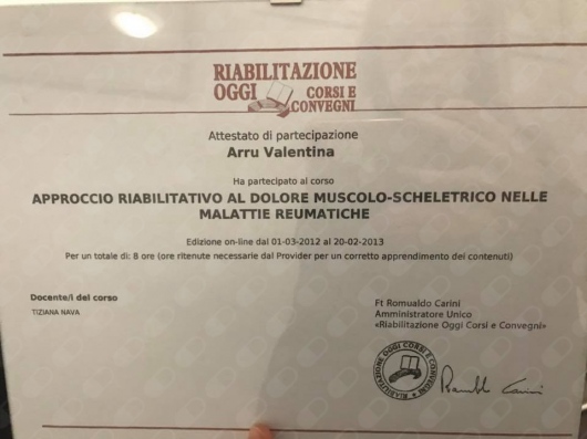 Ho riscontrato nella Persona della D.ssa Arru un'eccellente immediatezza nella percezione del trattamento indicato dal mio MMG. Essa è intervenuta con una professionalità ad alto livello di preparazione intercettando perfettamente le Zone suscettibili di lavorazione, nel mio caso dovute ad una spalla cronicamente dolorante ed ad un'infezione muscolare che non c'era verso di calmierare. Devo dire che con poche sedute si è giunti alla soluzione di entrambi i casi. Ho notizia che presso lo Studio Myfisio della D.ssa Arru, siano disponibili diverse attrezzat. elettromedicali, in regola con la Professione della D.ssa, per il trattam. di numerosi traumi post medicinali e/od ospedalieri.