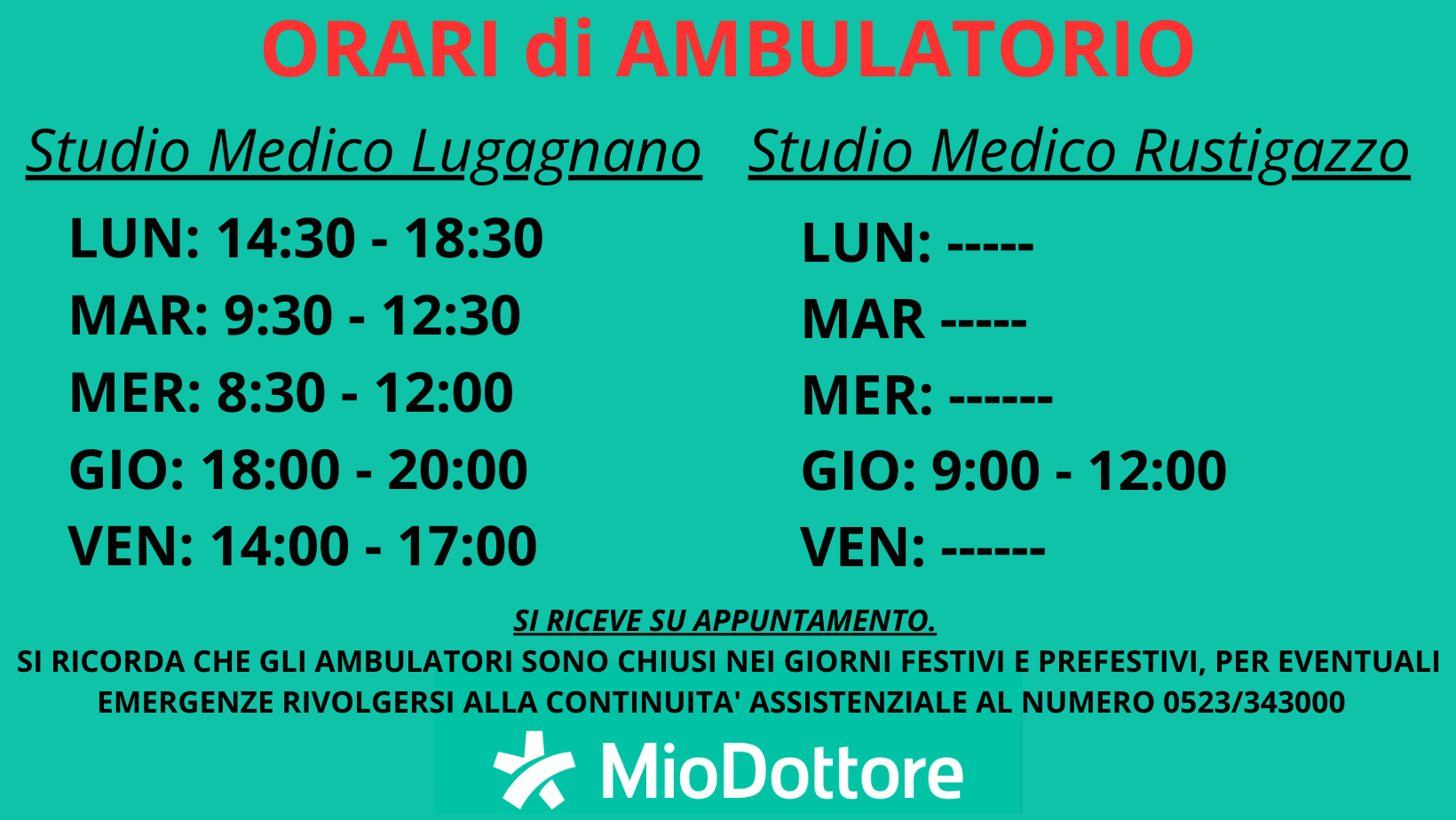 SI RICORDA CHE GLI AMBULATORI SONO CHIUSI NEI GIORNI FESTIVI E PREFESTIVI, PER EVENTUALI EMERGENZE RIVOLGERSI ALLA CONTINUITA' ASSISTENZIALE AL NUMERO 0523/343000
