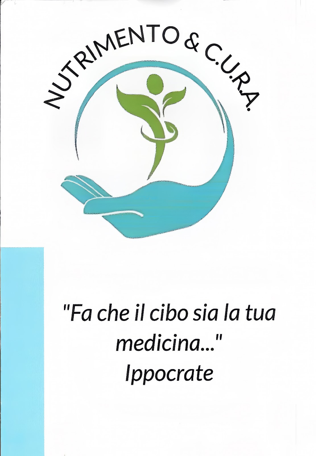 La persona è al centro in quanto protagonista del proprio percorso. La mano che avvolge la persona rappresenta il sostegno e la professionalità che metto al servizio di ogni paziente con l’obiettivo di rendere ciascuno consapevole delle proprie scelte di vita che possono portare alla salute o alla malattia. L’uomo si nutre non solo di cibo ma anche di relazioni e proprio questo nutrimento ci rende vivi, ci cura. Una cura che è intensa come il prendersi carico amorevolmente di qualcuno/qualcosa offrendo dedizione e tempo. E proprio il tempo scandisce i nostri ritmi di vita e ci rende “orologi biologici”, di qui l’acronimo C.U.R.A. ovvero Come Usare il Ritmo in Alimentazione: ogni cosa ha il suo Kairos, il suo tempo opportuno e scoprirlo ci aiuta a raggiungere il nostro obiettivo di salute.