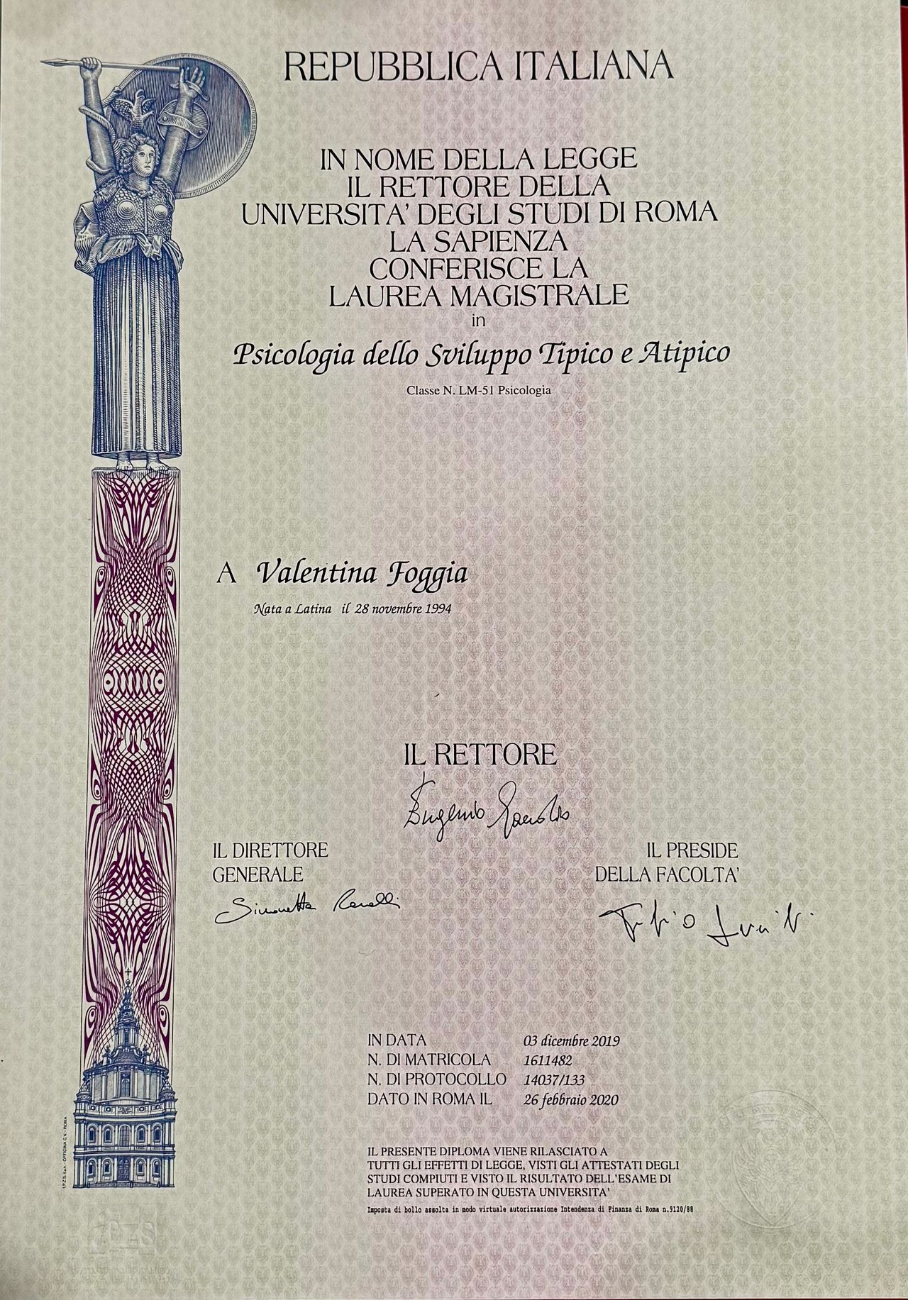 Sono la Dottoressa Valentina Foggia, psicologa dello sviluppo.