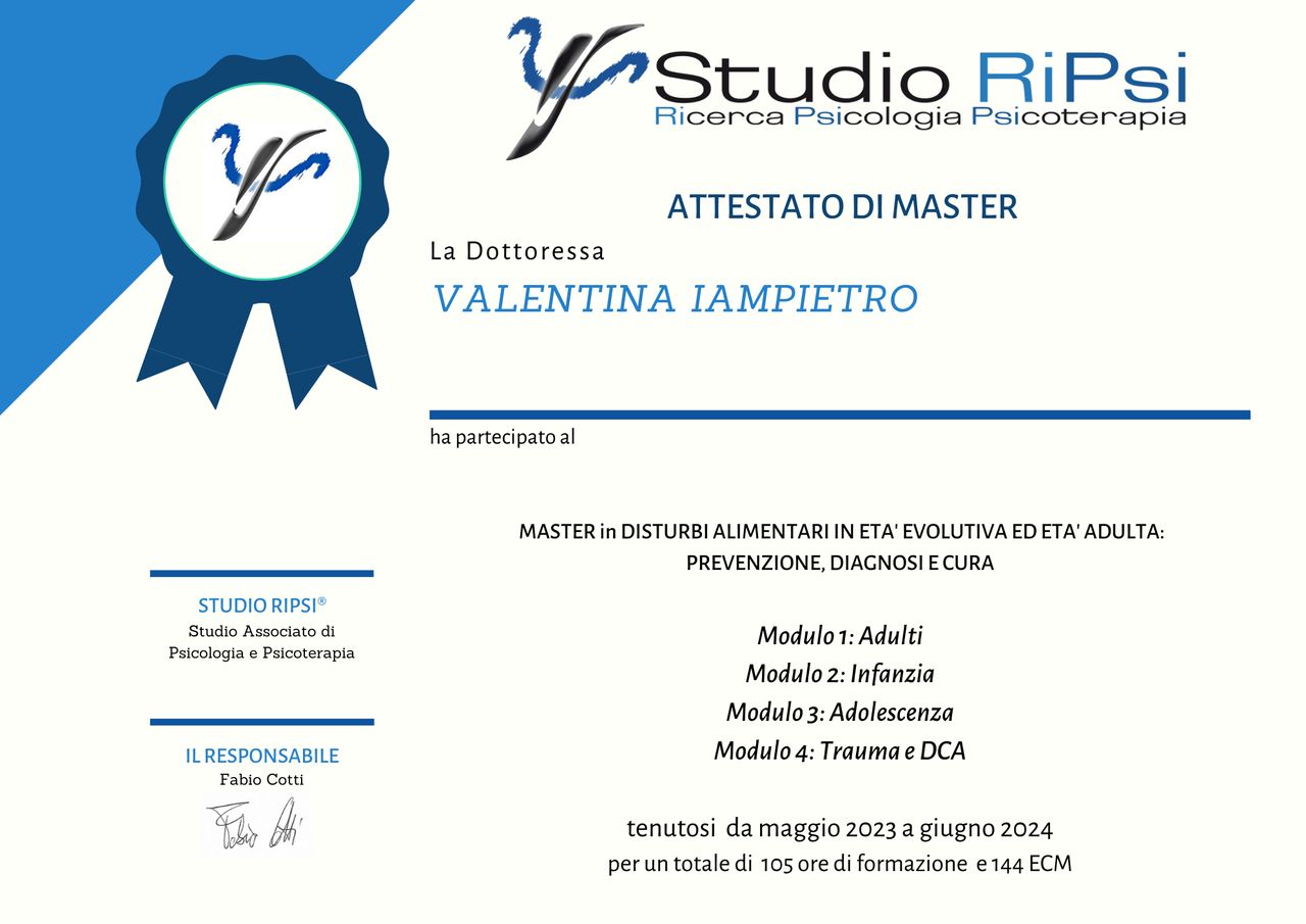 Nel 2024, ho conseguito un Master di Alta Formazione in DISTURBI ALIMENTARI IN ETA' EVOLUTIVA ED ETA'ADULTA: prevenzione, diagnosi e cura.