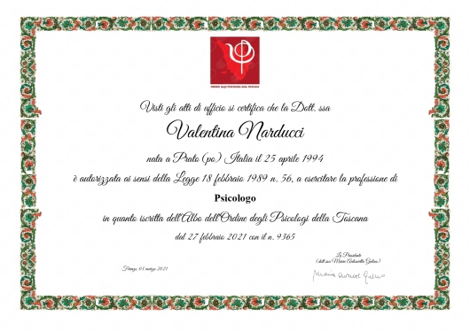 La mia esperienza con la dott.ssa Valentina Narducci ha avuto un impatto profondo e trasformativo nella mia vita. In un periodo di grande fragilità mi ha accompagnata con delicatezza, empatia e grande professionalità, guidandomi verso una nuova consapevolezza di me stessa. Ogni sessione con lei è stata uno spazio sicuro, dove mi sono sentita ascoltata, mai giudicata, e soprattutto compresa. La sua sensibilità e la sua attenzione verso ogni aspetto del mio percorso mi hanno fatta sentire vista e valorizzata. Il percorso fatto insieme a lei mi ha dato la forza di affrontare le mie paure, superare i miei blocchi e riscoprire la mia autenticità. È una professionista eccezionale, dotata di grande umanità. Sono profondamente grata per il suo lavoro. La consiglio assolutamente.