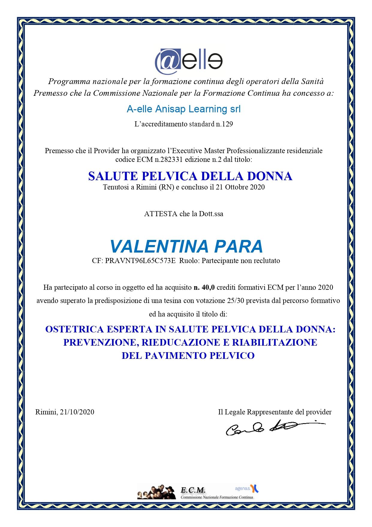 Nel 2020 Executive Master in salute pelvica femminile acquisizione del titolo di OSTETRICA ESPERTA IN SALUTE PELVICA DELLA DONNA PREVENZIONE, RIEDUCAZIONE E RIABILITAZIONE
