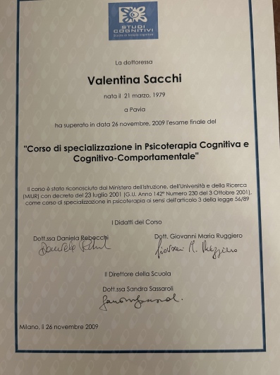La Dottoressa Valentina Sacchi è una psicologa psicoterapeuta cognitivo comportamentale. Iscritta all'albo degli psicologi della Lombardia con il nr 03/9588 e abilitata all'esercizio della Psicoterapia.