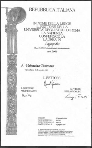 Valentina ha seguito regolarmente con sedute settimanali per quasi 5 anni il mio bambino, in collaborazione con un'altra logopedista in un centro di Roma, a partire dall'età di 5 mesi, dopo la diagnosi di ipoacusia bilaterale medio-grave e la prescrizione delle protesi acustiche. Grazie all'empatia stabilita con mio figlio ma allo stesso tempo alla dovuta disciplina educativa e all'appropriato metodo riabilitativo, grazie alla sua professionalità e alla continua volontà di tenersi aggiornata, al rapporto di collaborazione e fiducia instaurato con noi genitori, mio figlio ora di quasi 6 anni ha sviluppato un ottimo linguaggio ed un livello cognitivo in linea con i suoi coetanei normoudenti. Io e mio marito siamo estremamente soddisfatti e grati per la prestazione professionale ed umana di Valentina
