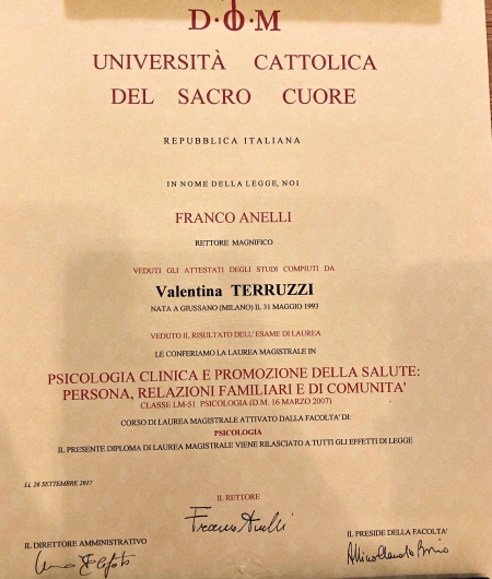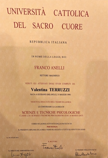 Sono Valentina Terruzzi, Psicologa Clinica laureata in Psicologia Clinica e Promozione della salute presso l'Università Cattolica del Sacro Cuore di Milano e abilitata alla professione tramite Esame di Stato.