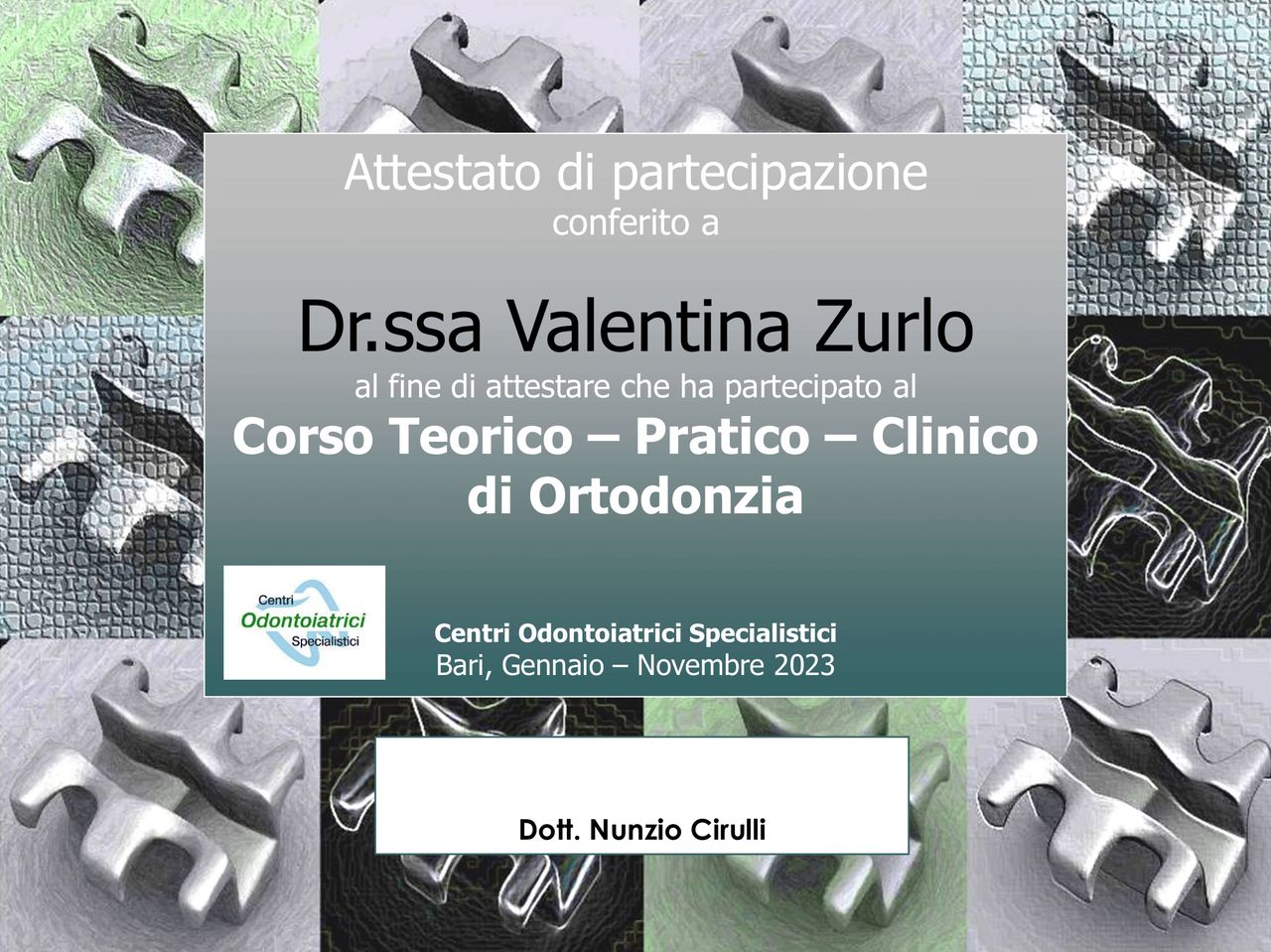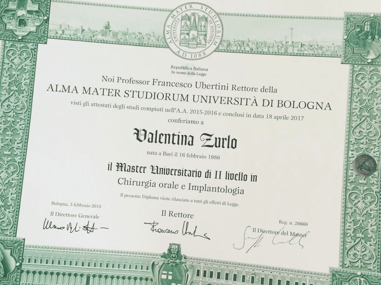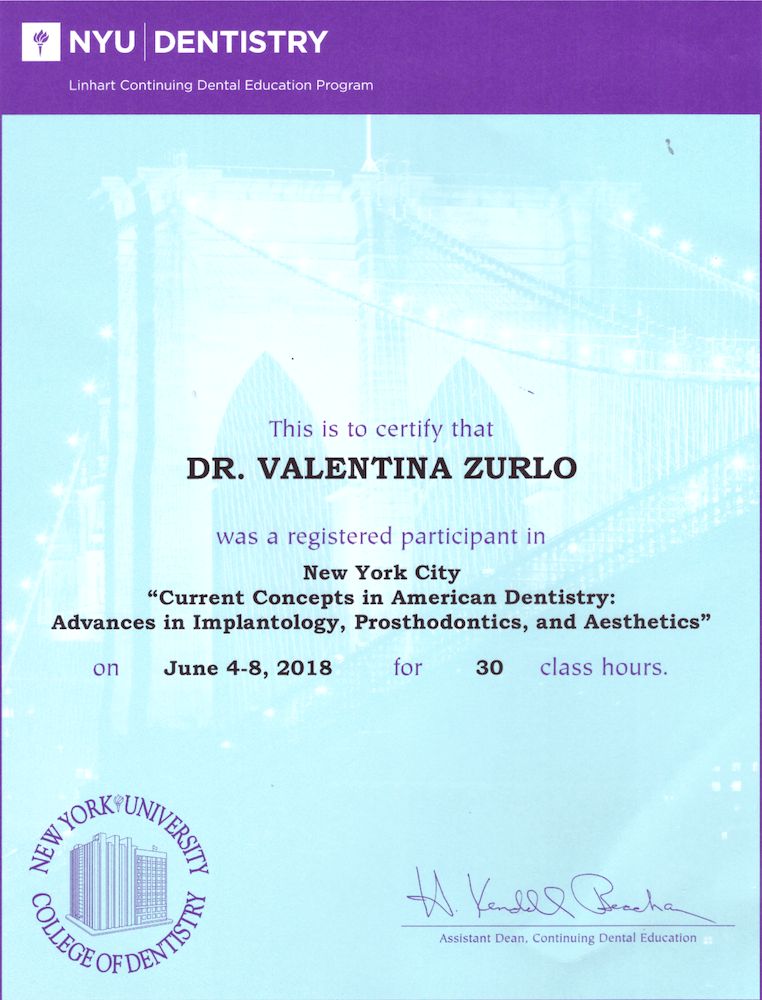 Dopo la laurea magistrale con lode presso l’Università di Bari ‘’Aldo Moro’’ in Odontoiatria e Protesi Dentaria, mi trasferisco a Bologna per 5 anni per proseguire il mio percorso formativo presso l’Università di Bologna ‘’ Alma Mater Studiorum’’ dove ho conseguito a pieni voti il Master Universitario in Chirurgia Orale ed Implantologia.Successivamente, frequento a New York il ‘’NYU College of Dentistry’’ per il Post- Graduate in Implantologia, Protesi Dentale ed Estetica.