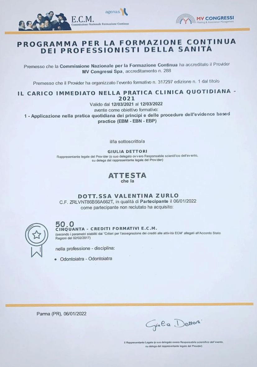 La dott.Zurlo,mi ha spiegato ogni passaggio con calma.L'intervento è stato assolutamente indolore e, contrariamente alle mie aspettative, non ho avuto dolori nemmeno nei giorni successivi.Ho riacquistato il sorriso e la capacità di masticare serenamente