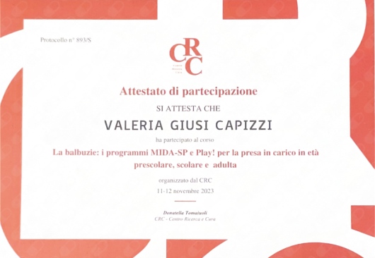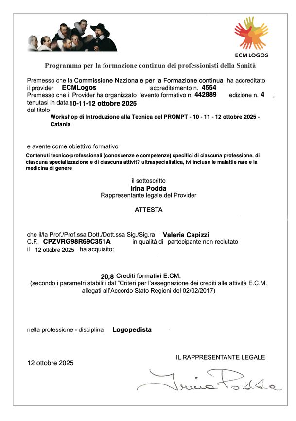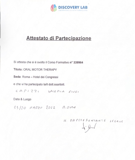 Da dicembre 2024 sono specialista in Motricità orofacciale grazie al MASTER universitario in “Motricità Orofacciale-Valutazione e riabilitazione logopedica” conseguito presso il Consorzio universitario Humanitas di Roma.