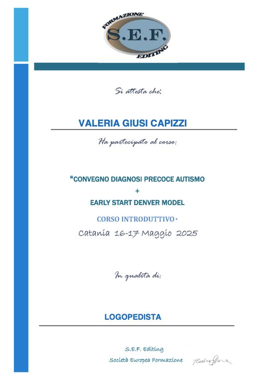Nell’ambito della balbuzie, grazie alla formazione al Centro Ricerca e Cura di Roma (Prof.ssa D. Tomaiuoli), utilizzo i programmi Play! e MIDA-SP per il trattamento delle disfluenze in età evolutiva, adolescenziale e adulta. Dal 2025 sono terapista ESDM (Early Strart Denver Model), un intervento precoce rivolto ai bambini in età prescolare (2-4 anni), uno dei metodi terapeutici più efficaci per potenziare le capacità cognitive e funzionali del bambino mirato a promuovendo lo sviluppo delle abilità sociali, comunicative e di apprendimento già a partire dal secondo anno di vita.