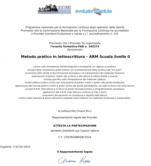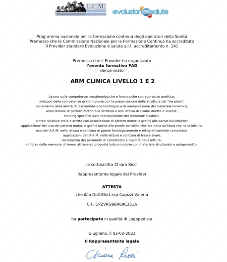 Logopedista PROMPT certificata e specializzata nella formazione ORAL MOTOR THERAPY (OMT). Terapista ARM per il trattamento dei disturbi specifici dell'apprendimento, quali dislessia, disgrafia e disortografia. MIR Specialist (Terzo Livello Di Formazione MODELLO MIR®:“Valutazione e Terapia logopedica delle funzioni orali secondo un approccio integrato con le Funzioni Esecutive”)