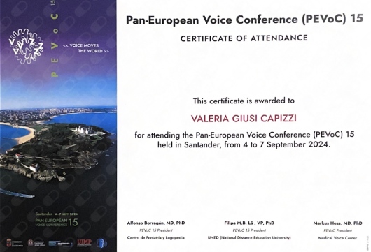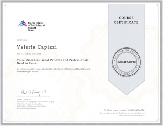 Mi occupo inoltre di disfonie di origine disfunzionale, funzionale e organica, paralisi cordali, noduli cordali, riabilitazione vocale post-chirurgia (polipo cordale, edema di reinke, laringectomia parziale e totale, cordectomia). Sono operatrice del metodo riabilitativo per il trattamento dei disturbi della voce ideato dal prof. Borragan (metodo PROEL), appreso presso il "Centro de Foniatria y Logopedia" di Santander (Spagna) e del metodo DOCTORVOX per la voce cantata, recitata e parlata, appreso durante la formazione a cura del Prof. Ilter Denizoglu presso la NVPI di Cracovia, Polonia.