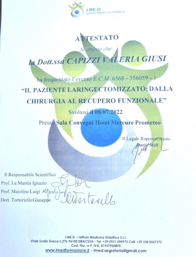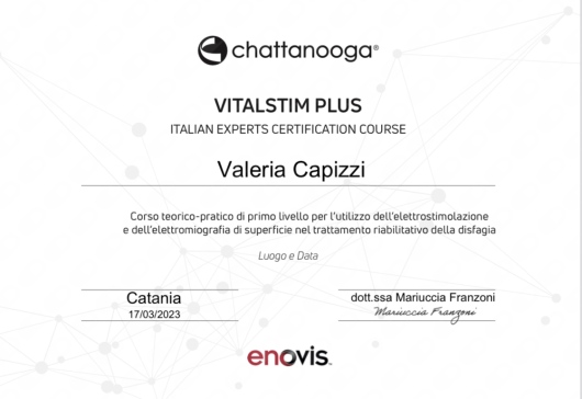 - VitalStim® Plus: Elettroterapia con sEMG Biofeedback (DISFAGIA E PARALISI DEL NERVO FACCIALE) Attualmente partecipo ad un Progetto di Ricerca, promosso dalla Neuroriabilitazione della Fondazione Santa Lucia di Roma, dal titolo “Valutazione dell'efficacia della riabilitazione logopedica con aggiunta della stimolazione elettrica neuromuscolare vs logopedia da sola in soggetti affetti da Sclerosi Multipla e disfagia”, presso gli ambulatori dell’ A. O. U. Policlinico G. Rodolico - San Marco di Catania.