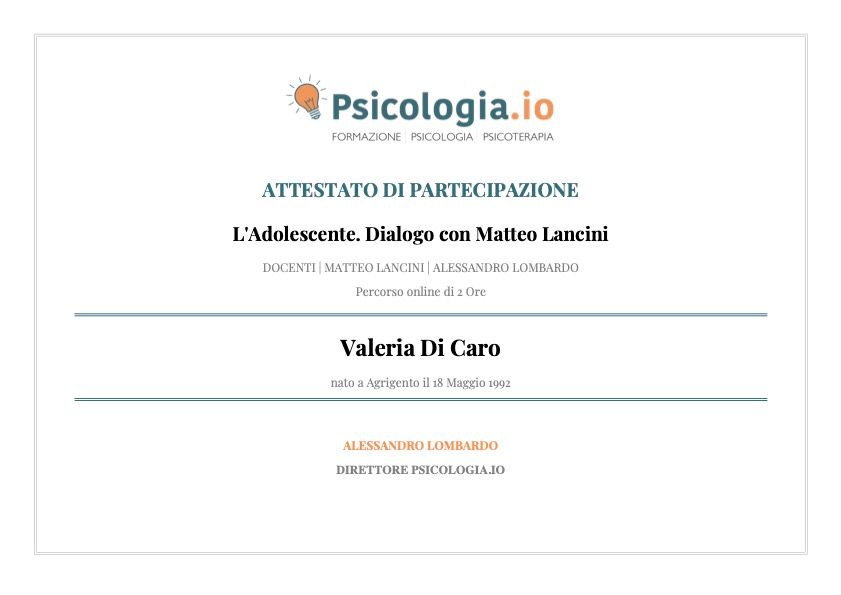 La dottoressa Valeria è una figura professionale di grande sensibilità e competenza. Durante il percorso con lei ho trovato uno spazio sicuro in cui potermi esprimere liberamente e affrontare aspetti di me che avevo sempre messo da parte. Con attenzione, rispetto e profonda empatia, mi ha guidato passo dopo passo in un processo di consapevolezza che sta facendo davvero la differenza nella mia vita. La sua presenza è stata per me un punto di riferimento fondamentale. La consiglio sinceramente a chiunque desideri iniziare un percorso di crescita personale con una terapeuta preparata e attenta.