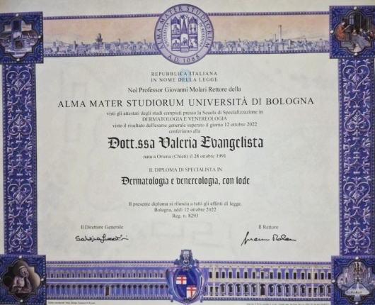 Medico Chirurgo, Specialista in Dermatologia e Venereologia presso Alma Mater Studiorum di Bologna (S. Orsola). Precedentemente Dirigente Medico presso AUSL Ravenna nella Disciplina di Dermatologia e Venereologia, poi specialista convenzionata presso ASL di Pescara DSB Penne. Perfezionata in: Dermatologia Generale e oncologica; Epiluminescenza; Dermatologia Pediatrica; Venereologia e patologie genitali; Tricologia e malattie delle unghie; Chirurgia dermatologica; Chirurgia Ungueale.