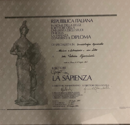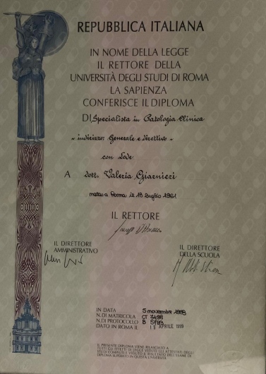 30/07/1985 Laurea in Medicina e Chirurgia conseguita presso l'Università di Roma “LA SAPIENZA”, 110/110 e lode.