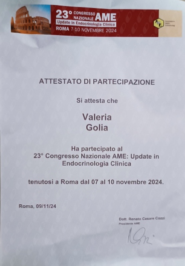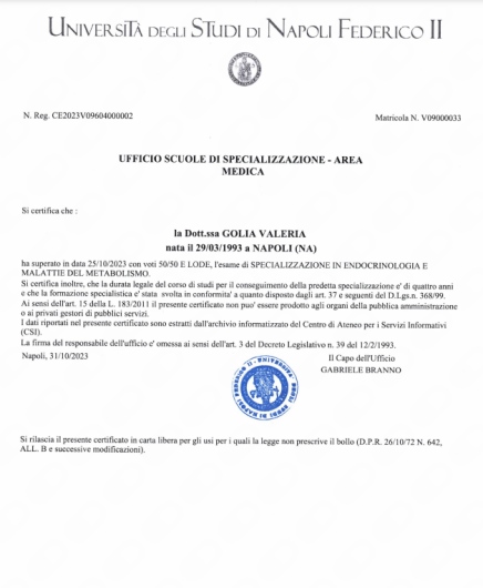 Nel 2023, ho ottenuto la specializzazione con lode in Endocrinologia e Malattie del Metabolismo presso l'Università degli Studi di Napoli Federico II. Durante il mio percorso di specializzazione, ho approfondito ogni aspetto dell'endocrinologia, con particolare attenzione alla diabetologia, guadagnando competenze approfondite in entrambe le discipline.